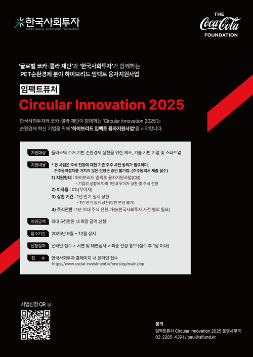 Impact Investment Corporation Korea Social Investment (Chairman Lee Jong-ik) announced on the 23rd that it will recruit companies participating in the second year of “Circular Innovation 2025” to grow innovative companies in the circular economy sector.